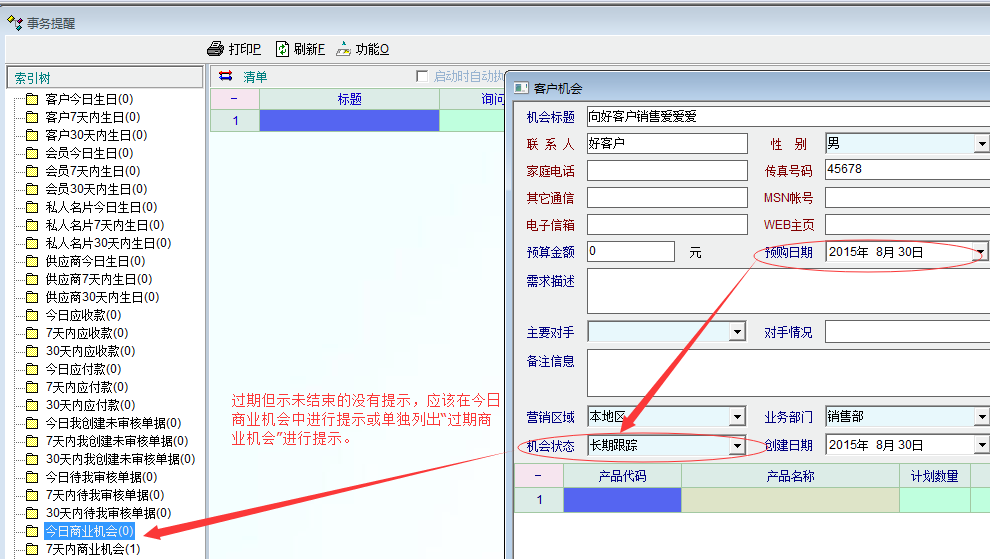 2、对于过期(比如三天前就过了预购日期)但非结束状态的商业机会,应该在今日商业机会中进行提示或者单独列出“过期商业机会”进行提示。建议将过期但未结束的商业机会一并在“今日商业机会”中进行提示。