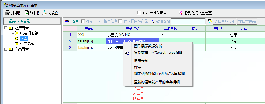 在“物资当前库存清单”的右键菜单中添加“出库单”、“入库单”等库存常用单据快捷键,尤其是出库单。我们在查询到库存明细后,一般都会进行库存操作,特别是出库操作。如果添加了右键菜单,就不用切换到出库单界面,方便快捷得多了。