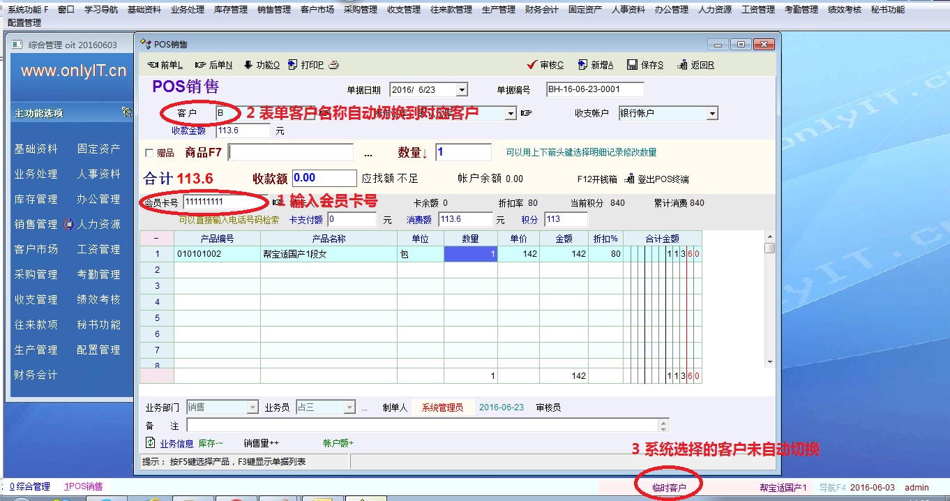 然后再做客户B的单据。输入会员卡号111111后,单据上的客户名已经自动切换到客户B。在单据中输入商品,但是引用的价格体系却为批发价。检查当时系统所选择的客户(图中标注3的位置),其实当时系统所选中的客户仍为“临时客户”,此时需要在客户栏重新回车确认一下,系统的选择才会改到客户B。