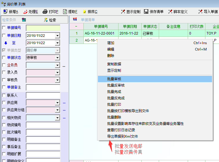 3、在按F3单据清单,检索单据后,批量发送。