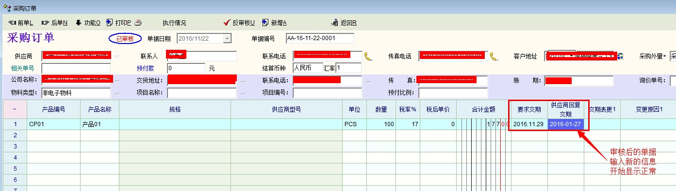 3、离开单据后在返回查看原单据信息,显示不正常;