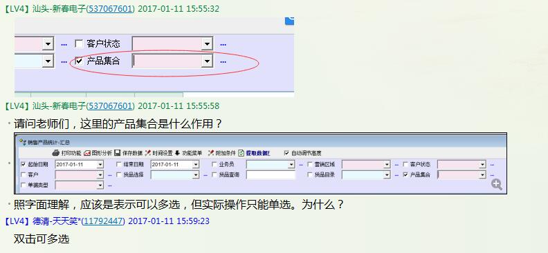 如图所示,产品集合照字面的理解,应该是可以多选。但如果是按照正常的操作点击选择框后面的省略号进入产品的选择界面后,只能选择一条产品(单选)。要想实现多选,必须通过在选择框内双击后进入产品选择界面才能实现,实在是很奇葩。如果不是热心的资深群友指点,真不知道如何实现。建议老师对此做出改进: