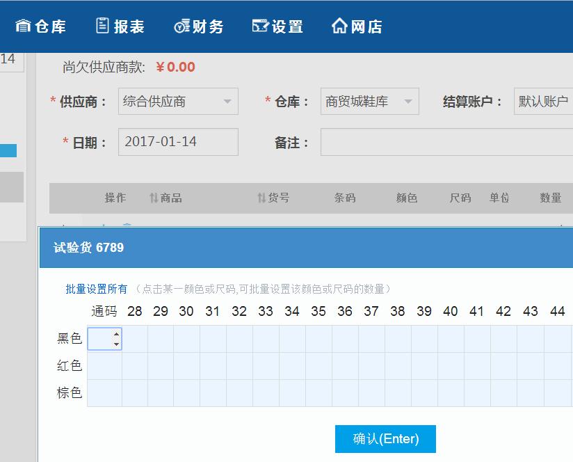 用商贸进销存已经有一些时间了,我对它还是有感情的,首先要感谢开发人员,也希望我们用的这个软件越来越好。我对行业特性的一点看法,软件尺码应该横排显示及录入 ,颜色和尺码要能同时单选和多选。这样方便操作录入商品。我贴一个秦丝软件的进货录入图片,希望老师们有所借鉴。
