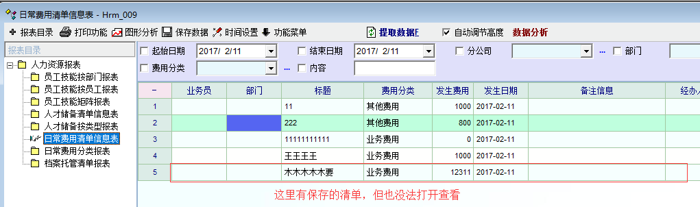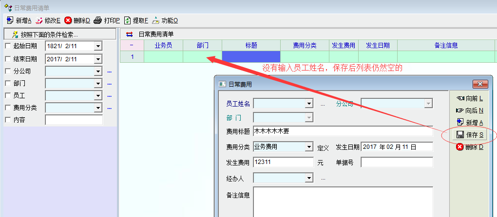 如图1,费用清单中没有输入员工姓名时,可以保存,但在清单列表中查询不到相关清单。在系统统计报表中可以看到相关清单,但也没法打开。