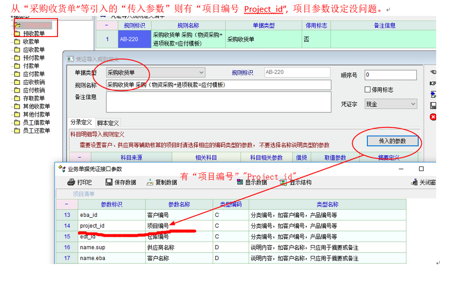 从“采购收货单”等引入的“传入参数”则有“项目编号 Project_id”, 项目参数设定没问题。