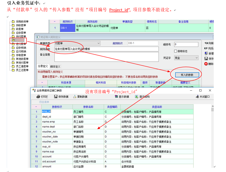 引入业务凭证中,从“付款单”引入的“传入参数”没有“项目编号 Project_id”, 项目参数不能设定。