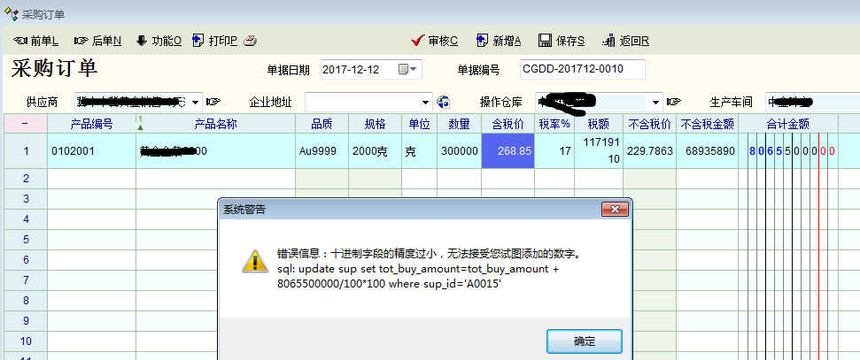 我们公司是从事贵金属贸易的公司,使用的咱们的进销存软件,使用中出现了无法录入的问题,提示错误时“十进制精度的字段过小,无法接收您试图添加的数字”后面还有一段代码。