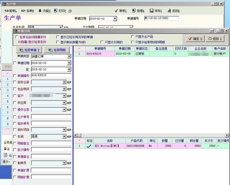 单据要审核后才能够被下级单据引用。这个肯定是知道的 "加工入库单"在相关业务流程中改成 加工入库单引用出库单的话,引用过来的不是所需要入库的明细 PS:产品是由2个物料组装而成的 |