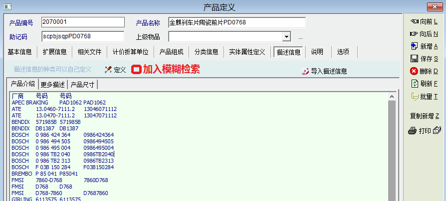 进销存软件目前模糊查询的内容限定在产品定义的“基本信息”中的各个字段。但是由于“基本信息”中的这些字段长度有限,很多时候需要把产品的重要信息放在“描述信息”页中加以补充描述。但是这样在模糊查询时,就查不到“描述信息”中的这些内容。