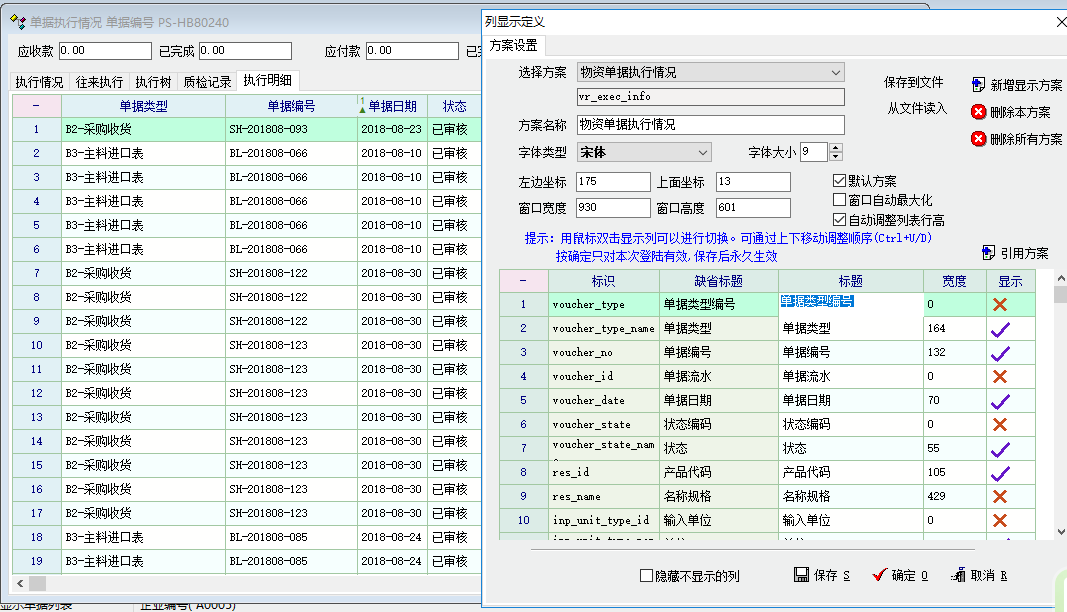 另外在单据的执行情况界面的显示定制里面也看不到行业属性项目.