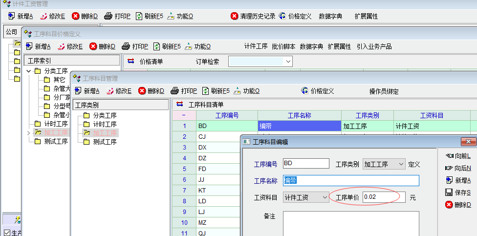 如图,建议为生产单元的物资单据的工序添加价格信息,类似计件工资计算中的工序科目一样。在生产环节中,我们有许多产品的加工工序是外发给供应商进行加工的,所以需要对加工工钱进行计算。目前的系统中加工单的价格只能与产品价格进行关联。产品价格与加工工序价格是完全不一样的,这样要对供应商的加工工钱进行计算就比较麻烦了。建议为生产单元的物资单据的工序添加价格信息,并让加工工序与工序价格可以进行绑定。