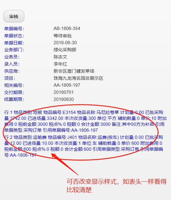 手机端可否改善单据的显示格式,单据明细内容可否设成象单据表头一样显示,现在这样显示看得眼花。 |