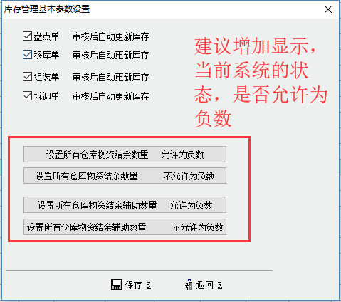 建议库存管理参数设置,增加状态显示,如图,方便打开就知道当前状态