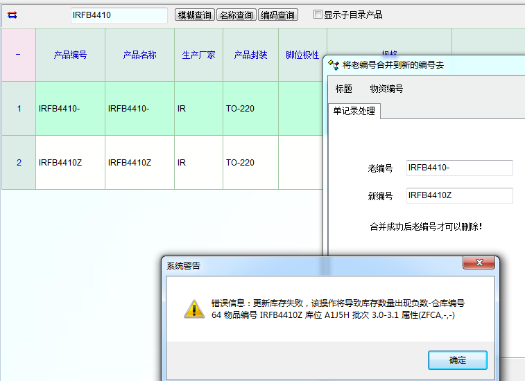 如图,合并物资编号时出错,请问如何解决?在库存清单中查询时,导致出错的库存明细(库位A1J5H,批次3.0-3.1...)并不存在。