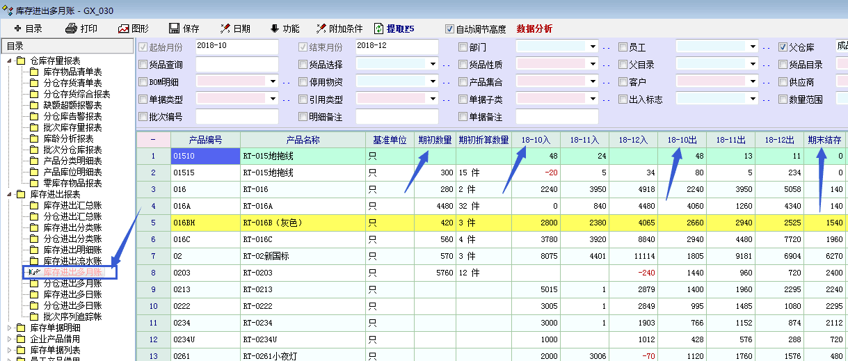 现库存进出多月账只能统计每月出入数量,不能统计金额。