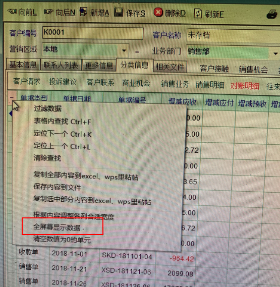 因为没法完整显示整个报表内容,每次想看报表内容,都要用到“全屏幕显示数据”命令。目前这个命令包含在左上角的这个菜单中,频繁使用起来还是麻烦低效,建议把“全屏幕显示数据”添加到鼠标右键快捷菜单中