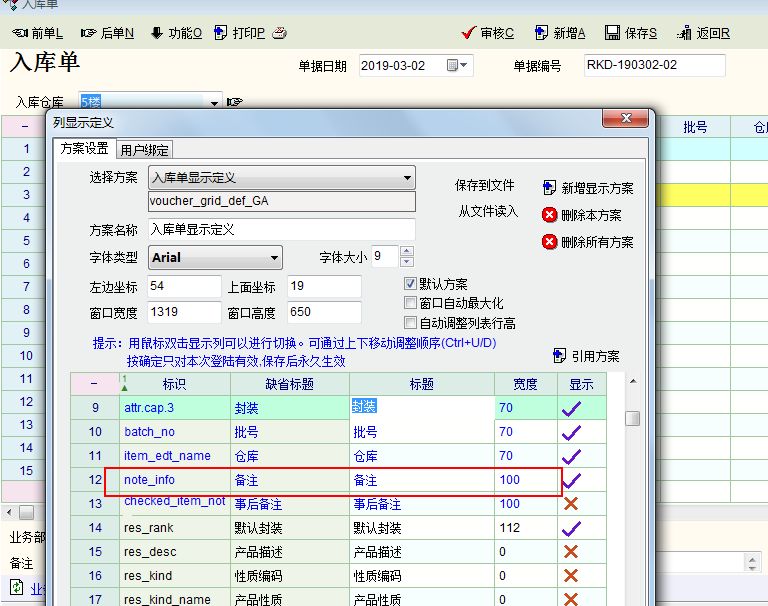如图,当前产品 完整库存清单(不限定仓库)的列表中没法显示入库单明细物资的备注内容,建议在“显示定制”中添加此项内容。