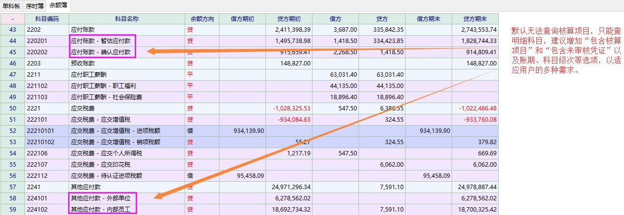 软件提供了余额簿功能,相对方便了一些,但是默认无法查询包含有核算项目的会计科目,也没有账期、科目级次、是否包含未审核凭证等选项,实用性大打折扣。建议软件提供类似金蝶软件的选项:”包含核算项目“、”包含未审核凭证“、账期、科目层级等,这样就可以更好地满足不用的需求了。