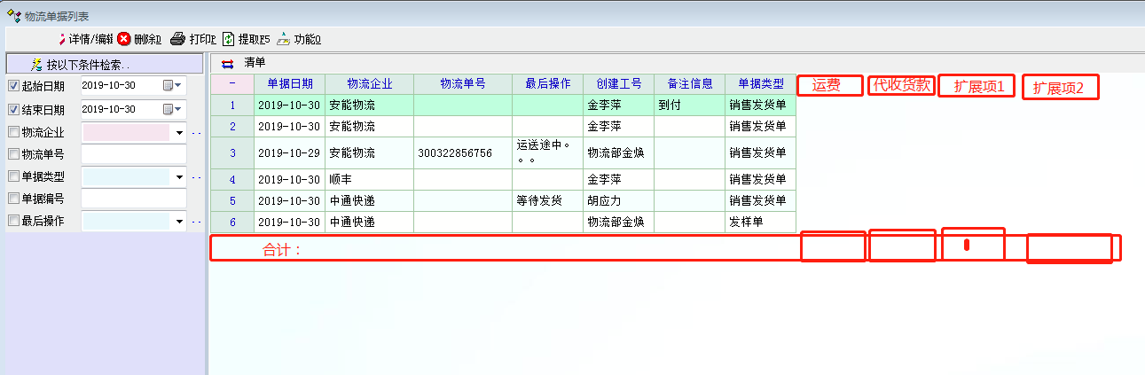 物流单据列表现在只有物流企业、物流单号、最新操作、备注信息、更新日期这几项。不同的企业出于不同的目的、业务要求,会对物流信息需要记录的内容有不同的要求,像我们就非常需要代收金额、物流费用等信息,但众口难调,可能别的用户也会有别的不同要求,:)嘿嘿,以上是复制另一个用户的需求内容,希望大神们能在下次更新时考虑增加几个,哪怕人工输入我们也是很期待的。。。
