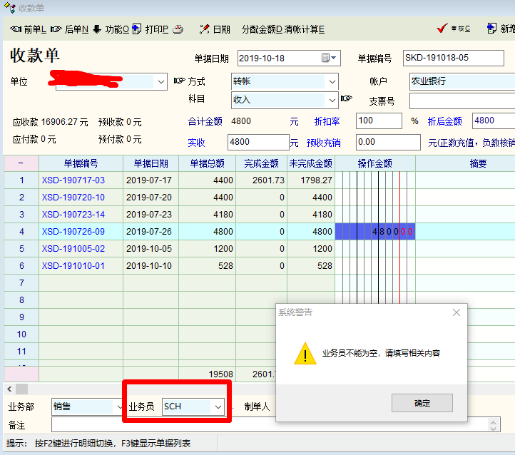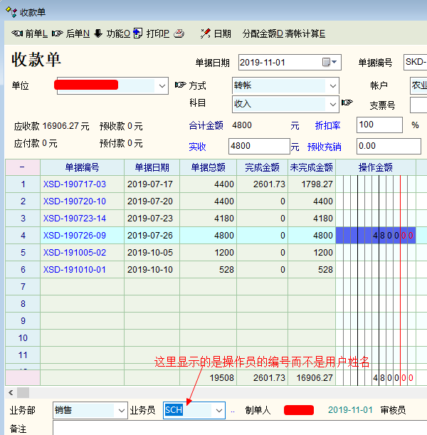 新版本将操作员用户编号由中文改成英文后往来款单据(如收款单)保存时提示“业务员不能为空,请填写相关内容”的提示